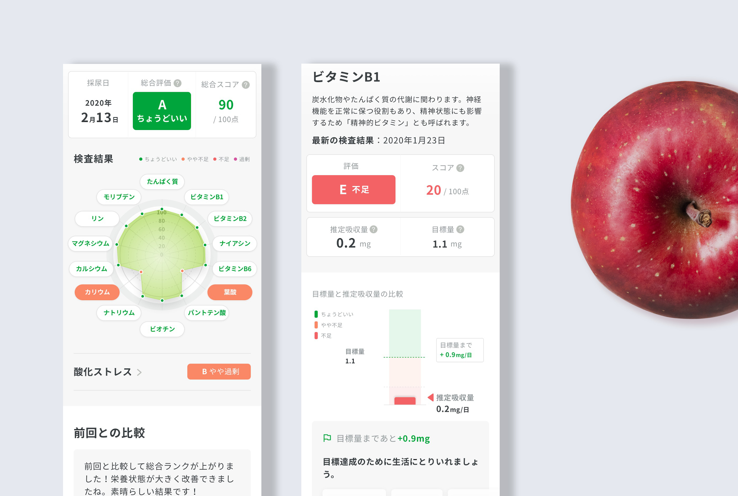 ということが見た目でわかるので、特に凹んでいる箇所や警告色ラベルの栄養素を覚えておくことで、自分がなにを改善すればよいのかが把握しやすいのが特徴です。